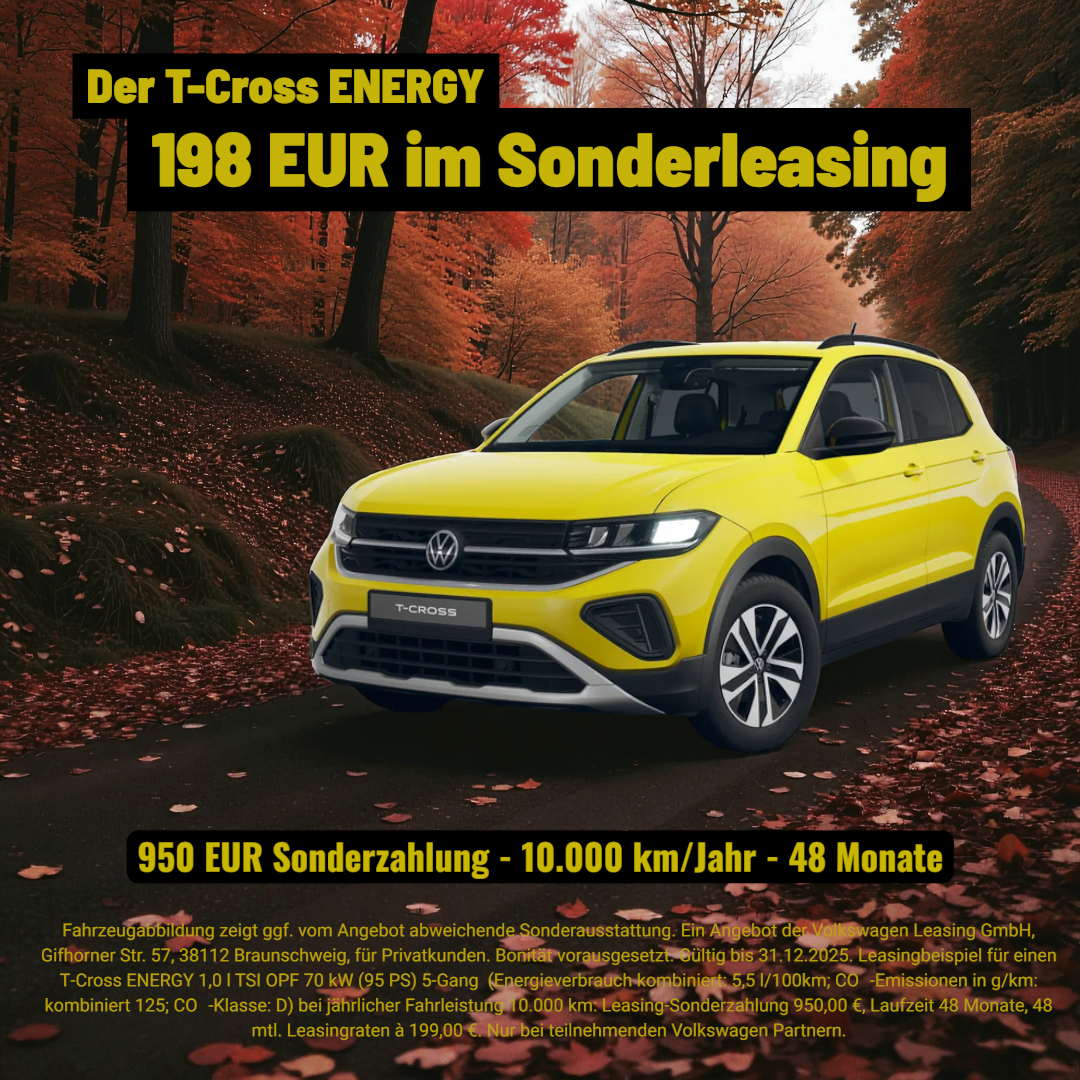 Der T-Cross ENERGY kombiniert modernes Design, kompakte Abmessungen und clevere Ausstattung mit einem unschlagbaren Preis-Leistungs-Verhältnis – perfekt für Stadt und Alltag.